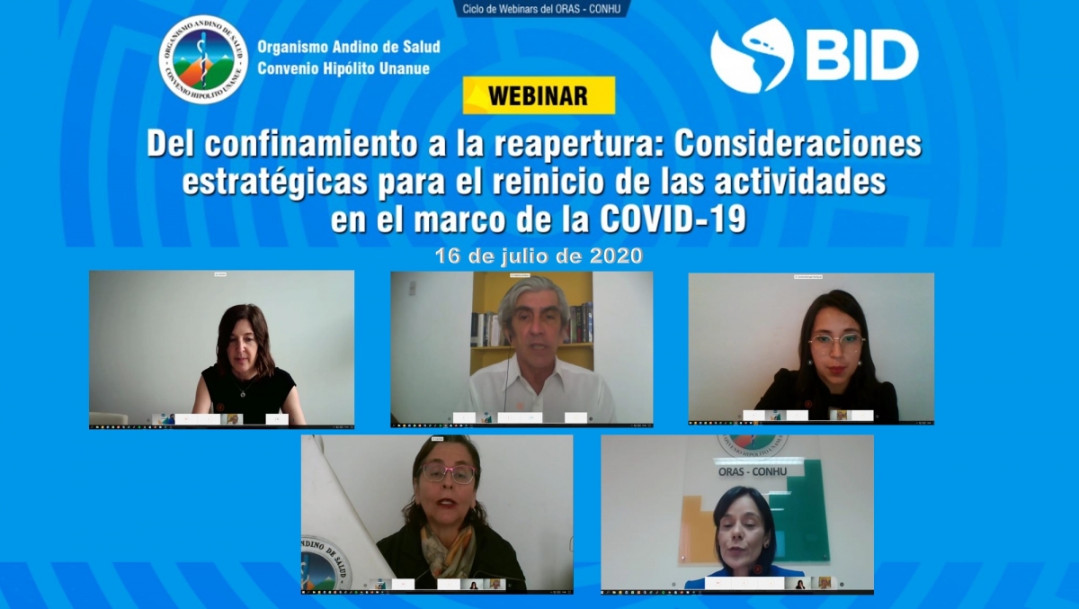 La pandemia ocasionada por el COVID-19 presenta cifras alarmantes, resulta indispensable en el plazo inmediato y durante los próximos meses, invertir en la contención de la pandemia y asegurarse de que la reapertura ocurra en las mejores condiciones posibles.  Este fue el tema central  de este webinar que realizó el ORAS – CONHU junto al Banco Interamericano de Desarrollo BID y que contó con la participación del Comité Andino de Salud y Economía; y la Mesa de Concertación para la Lucha contra la Pobreza.  Durante el seminario virtual se analizaron las recomendaciones para que la reapertura ocurra en las mejores condiciones posibles garantizando la protección de la población, las buenas prácticas de autocuidado y la gestión de ámbitos clave para prevenir el contagio por COVID-19.