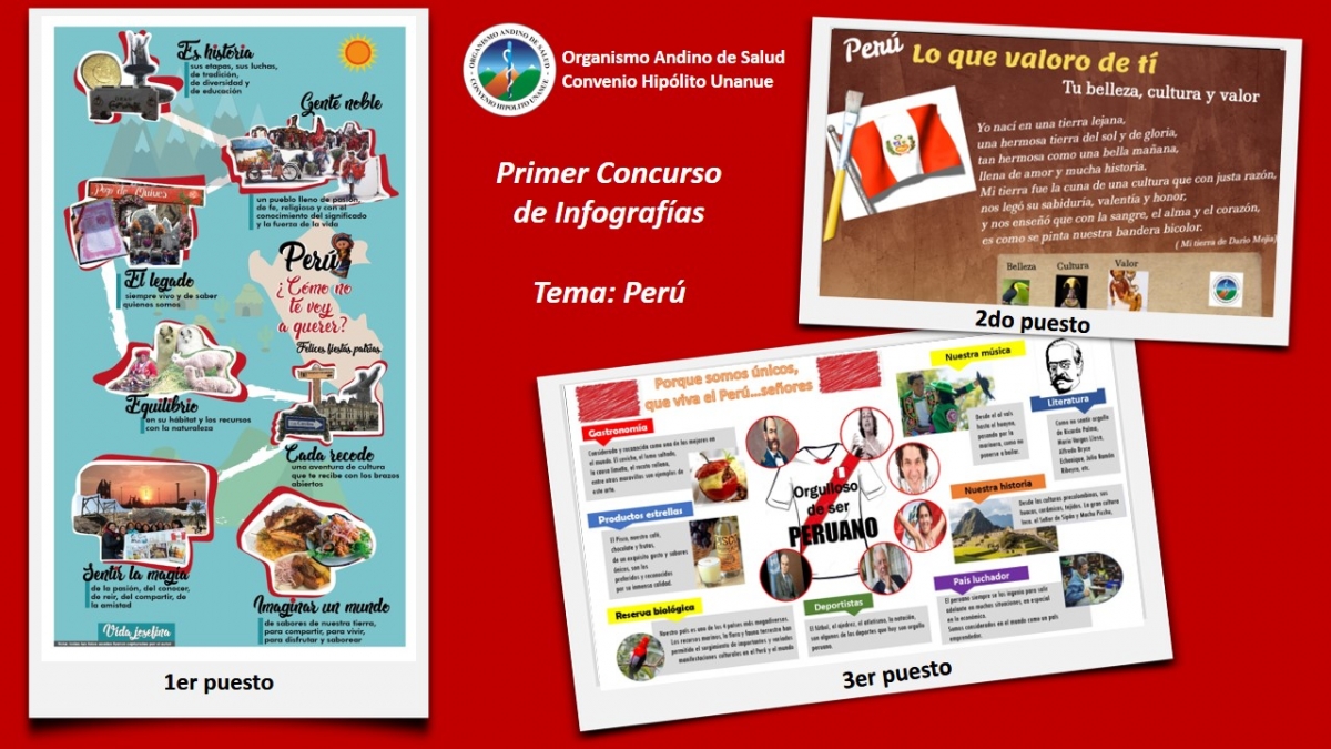 El Primer Puesto fue para Yadira Salas, quien con el lema: Perú ¿Cómo no te voy a querer? resaltó la historia, el legado, las tradiciones, los paisajes y su gente, haciéndose acreedora del máximo premio. El segundo puesto fue para Marianela Villalta quién hizo una infografía animada, y el tercer puesto fue para Miguel La Rosa. Todos los trabajos serán publicados en nuestra página web y redes sociales en el siguiente link: http://orasconhu.org/concurso-infograf%C3%ADa-per%C3%BA