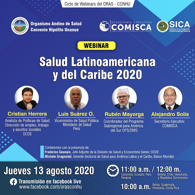 El día jueves 13 de agosto a las 11:00 am (hora Perú) el ORAS - CONHU presenta la edición número 16 de su ciclo de webinars, con el tema "Salud Latinoamericana y del Caribe 2020" en coordinación con SE-COMISCA SICA,con la participación de OCDE, el Ministerio de Salud del Perú, y el Banco Mundial.