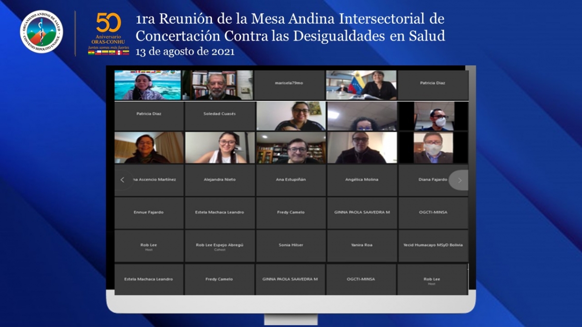 El 13 de agosto, el ORAS-CONHU realizó la Primera reunión de la Mesa Andina Intersectorial de Concertación Contra las Desigualdades en Salud, con la participación de 21 funcionarios designados por los Ministerios de Salud de los seis países andinos, un asesor Regional en Epidemiología Social y Equidad en Salud (OPS/WDC) y un asesor del Programa Subregional para América del Sur. Por el ORAS-CONHU participaron las Dras. María del Carmen Calle Dávila (Secretaria Ejecutiva; Marisela Mallqui Osorio (Secretaria Adjunta); Bertha Luz Pineda Restrepo (Coordinadora de cambio climático y otras áreas temáticas) y Ernesto Rodríguez Ignacio (Consultor).
