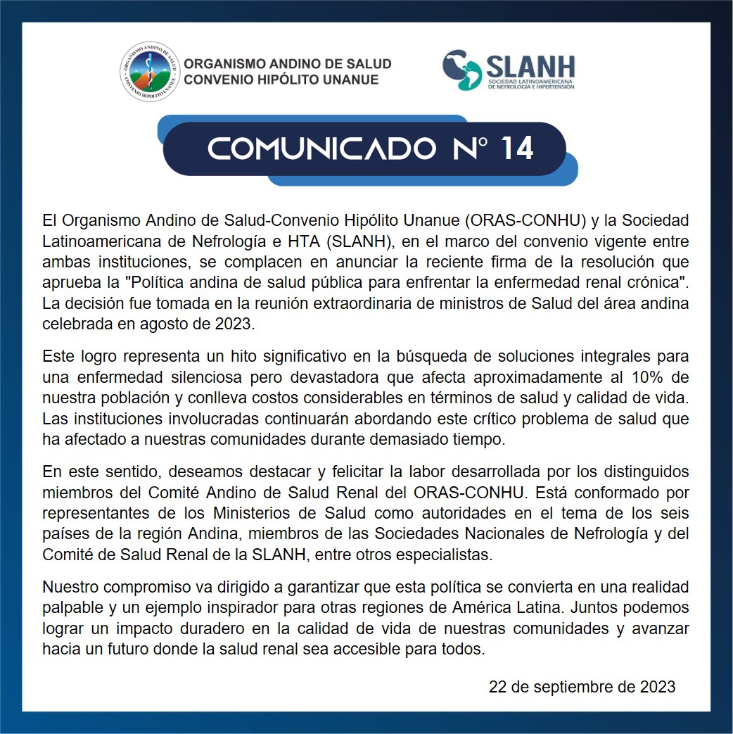 El Organismo Andino de Salud-Convenio Hipólito Unanue (ORAS-CONHU) y la Sociedad Latinoamericana de Nefrología e HTA (SLANH), en el marco del convenio vigente entre ambas instituciones, se complacen en anunciar la reciente firma de la resolución que aprueba la "Política andina de salud pública para enfrentar la enfermedad renal crónica". La decisión fue tomada en la reunión extraordinaria de ministros de Salud del área andina celebrada en agosto de 2023.