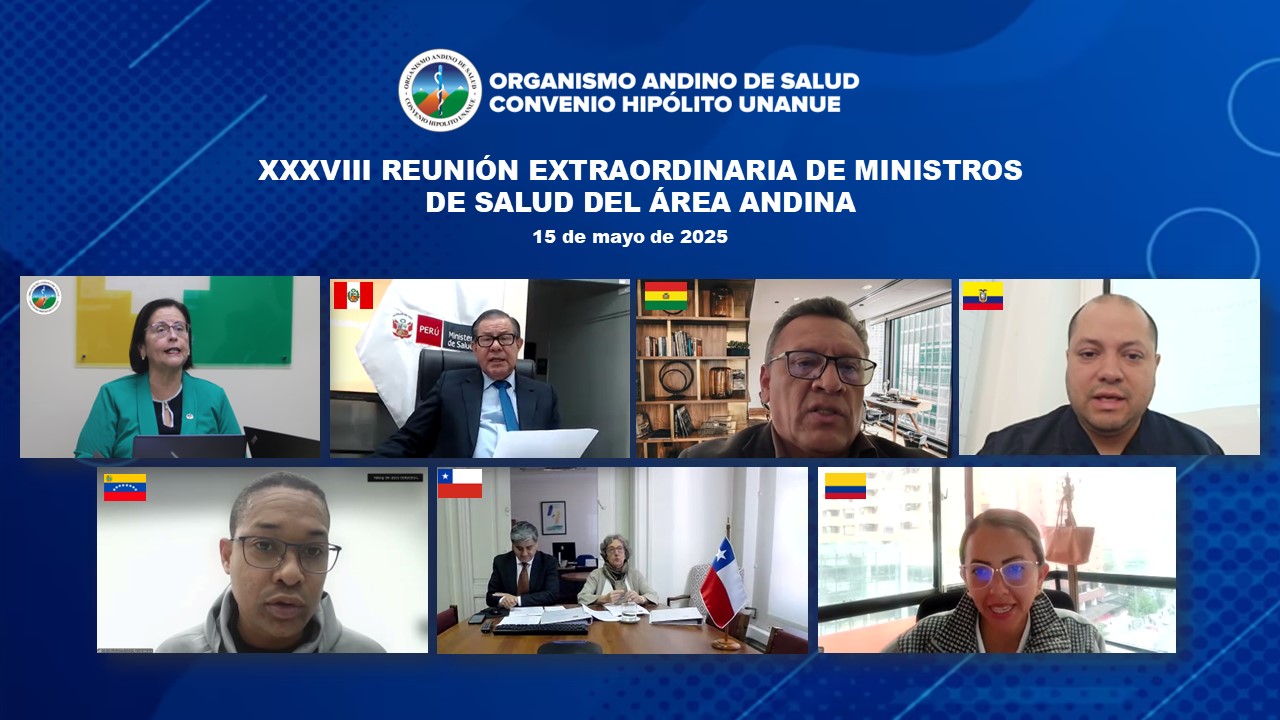 Lima, 15 de mayo de 2025.- La XXXVIII Reunión Extraordinaria de Ministros de Salud del Área Andina, instancia máxima del Organismo Andino de Salud-Convenio Hipólito Unanue (ORAS-CONHU), realizada hoy, de forma virtual, congregó a los representantes de los Ministerios de Salud de Bolivia, Chile, Colombia, Ecuador, Perú y Venezuela, con el propósito de fortalecer la gobernanza regional en salud y la consolidación de una agenda sanitaria común.