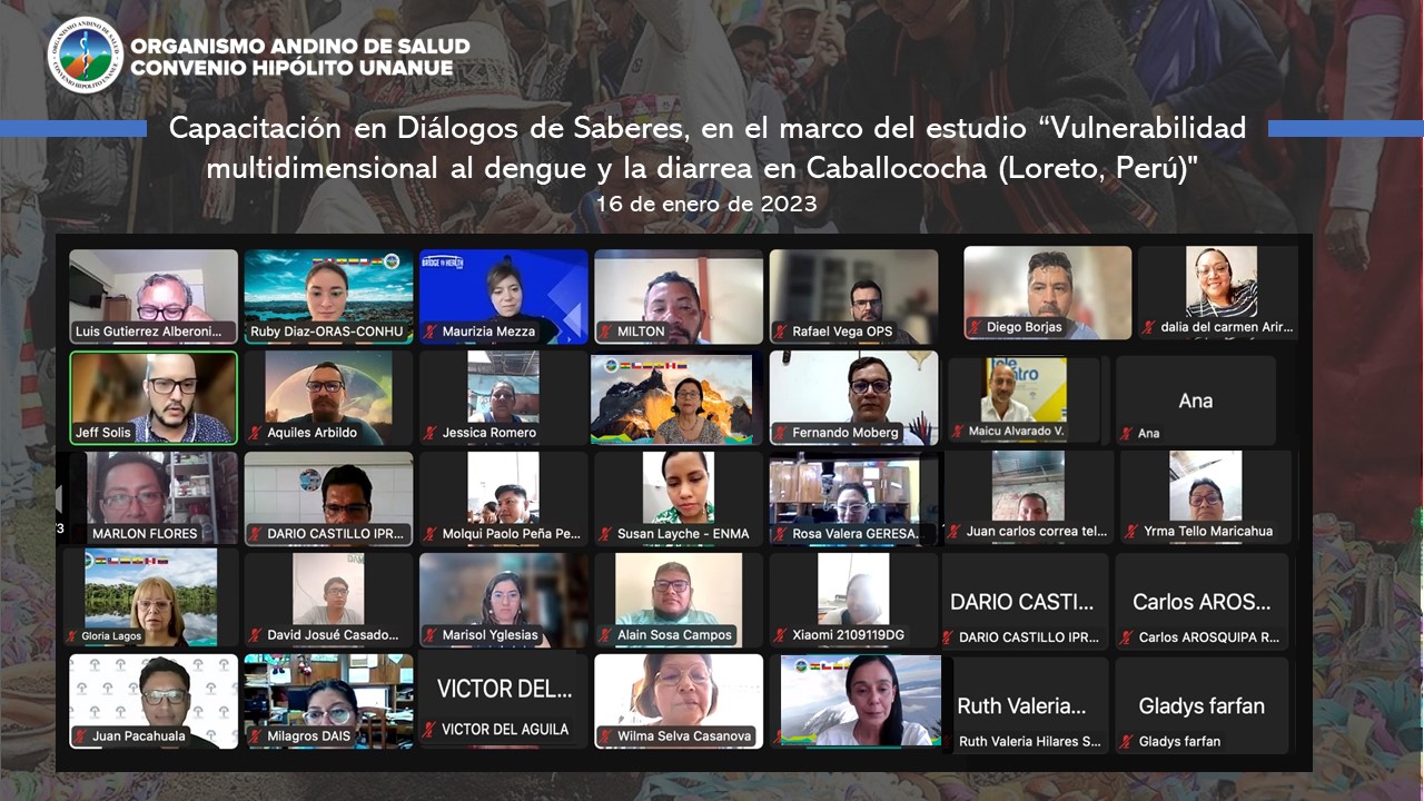El día de hoy se dio inicio a la Capacitación en Diálogos de Saberes, en el marco del estudio "Vulnerabilidad multidimensional al dengue y la diarrea en el contexto de la crisis climática: Un estudio exploratorio con enfoque transdisciplinario en Caballococha (Loreto, Perú); organizado en forma conjunta por el Organismo Andino de Salud; Bridge to Health U.S.A; el Laboratorio de EcoSalud y Ecología Urbana de la UPCH; el Centro Latinoamericano de Excelencia en Cambio Climático y Salud de la Universidad Peruana Cayetano Heredia; la Organización Panamericana de la Salud OPS/OMS; Ortiz Orbital Latinoamérica; y la Federación de Comunidades Nativas de la Cuenca del Corrientes. Esta actividad cuenta con el financiamiento del Instituto Interamericano para la Investigación del Cambio Climático, y con la importante participación como facilitadores, de los doctores Sandra del Pino, Luis Gutiérrez y Rafal Vega, de la OPS/OMS Washington.