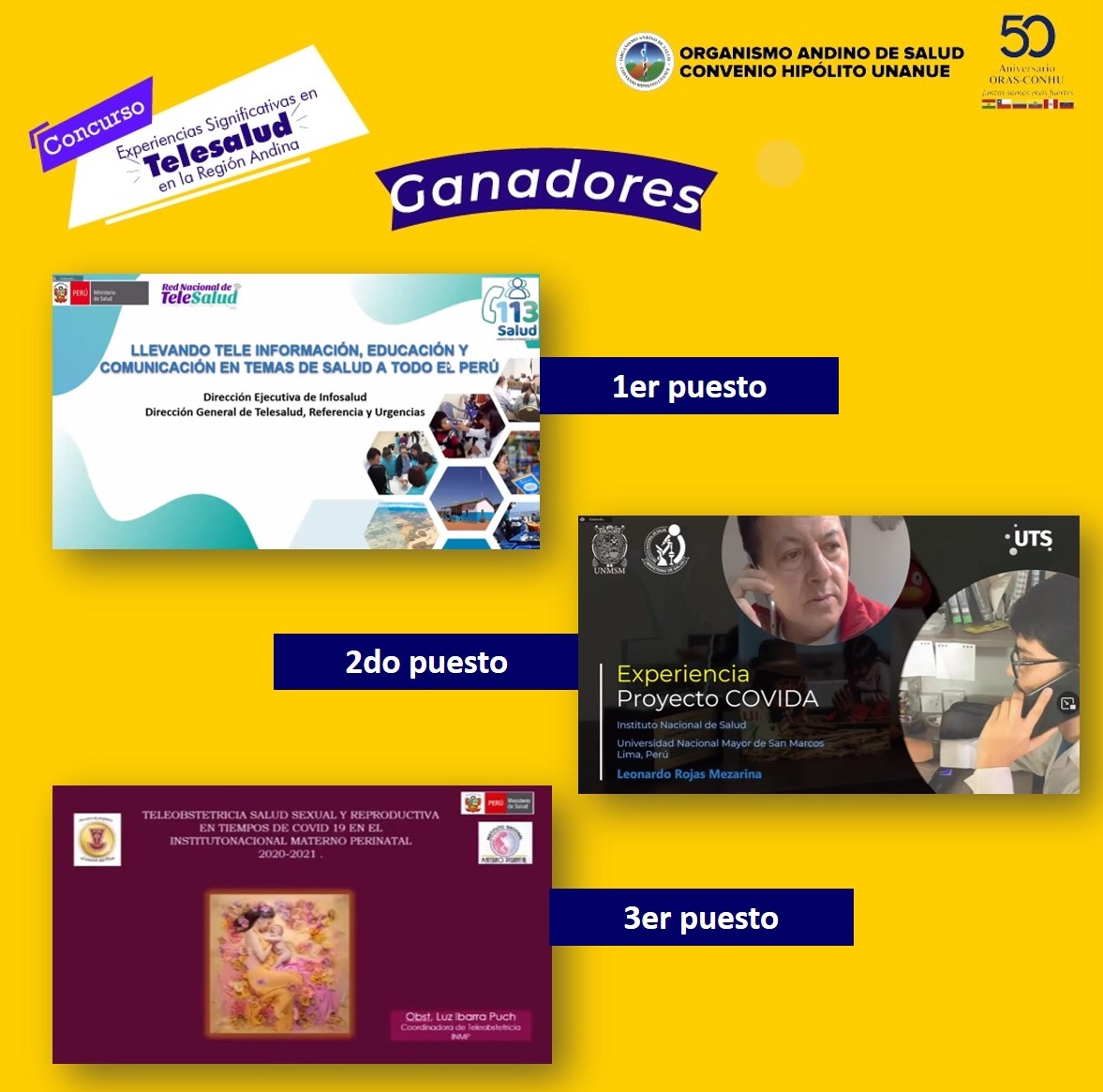 El ORAS-CONHU realizó con gran éxito el Concurso "Experiencias Significativas en Telesalud en la Región Andina", el marco de los 50 años del ORAS-CONHU para reconocer y difundir experiencias destacadas implementadas por los ministerios de salud de Bolivia, Chile, Colombia, Ecuador, Perú y Venezuela a nivel nacional, subnacional o local en temas relacionados a telesalud (telemedicina, tele educación, entre otros) orientados a la promoción, prevención, atención, rehabilitación, cuidados paliativos y/o vigilancia epidemiológica, durante el contexto de emergencia sanitaria por la pandemia de la COVID-19.