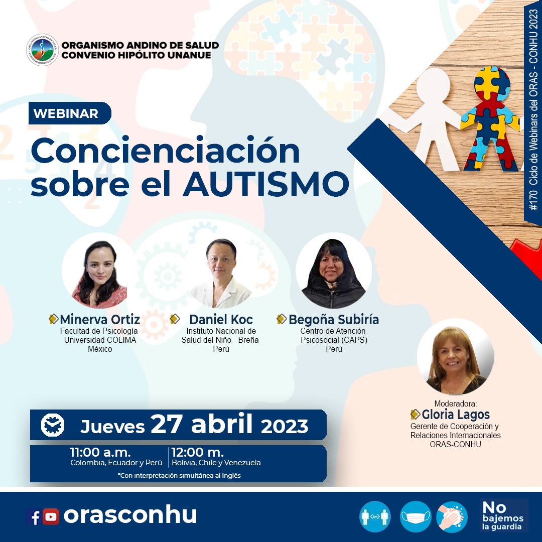 G, Lagos., MC, Calle., M, Ortiz., K, Daniel., B. Subiría (2023, 27 abril). W0170 Concienciación sobre el AUTISMO [Webinar]. Organismo Andino de Salud - Convenio Hipólito Unanue.