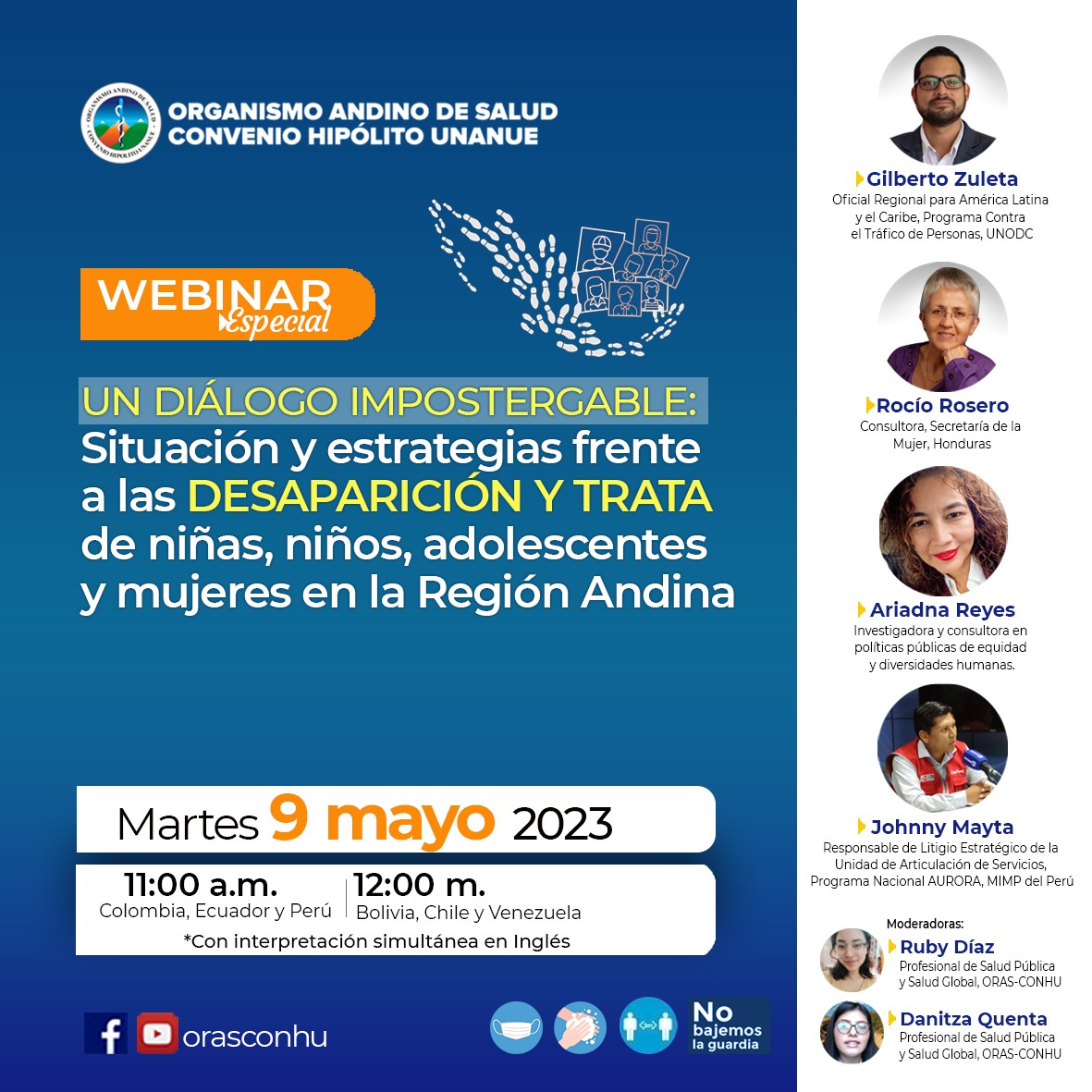 R, Díaz., M, Mallqui., G, Zuleta., R, Rosero., A, Reyes., J, Mayta (2023, 9 mayo). W0172 Un diálogo impostergable: Situación y estrategias frente a las desapariciones y trata de niñas, niños, adolescentes y mujeres en la Región Andina [Webinar]. Organismo Andino de Salud - Convenio Hipólito Unanue.