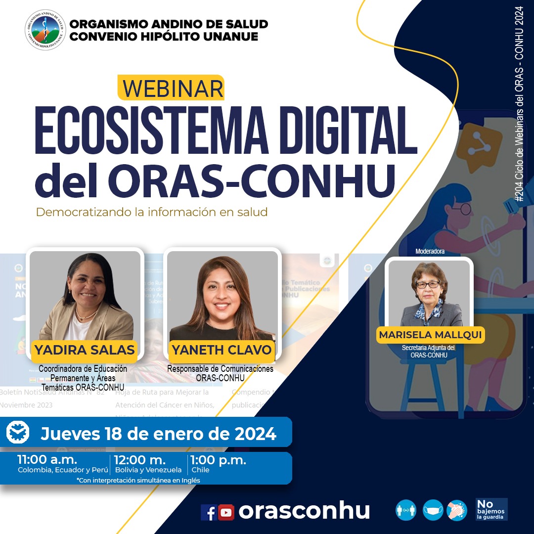 M, Mallqui, MC, Calle., Y, Salas., Y, Clavo (2024, 18 enero). W0204 "ECOSISTEMA DIGITAL del ORAS-CONHU: democratizando la información en salud [Webinar]. Organismo Andino de Salud - Convenio Hipólito Unanue