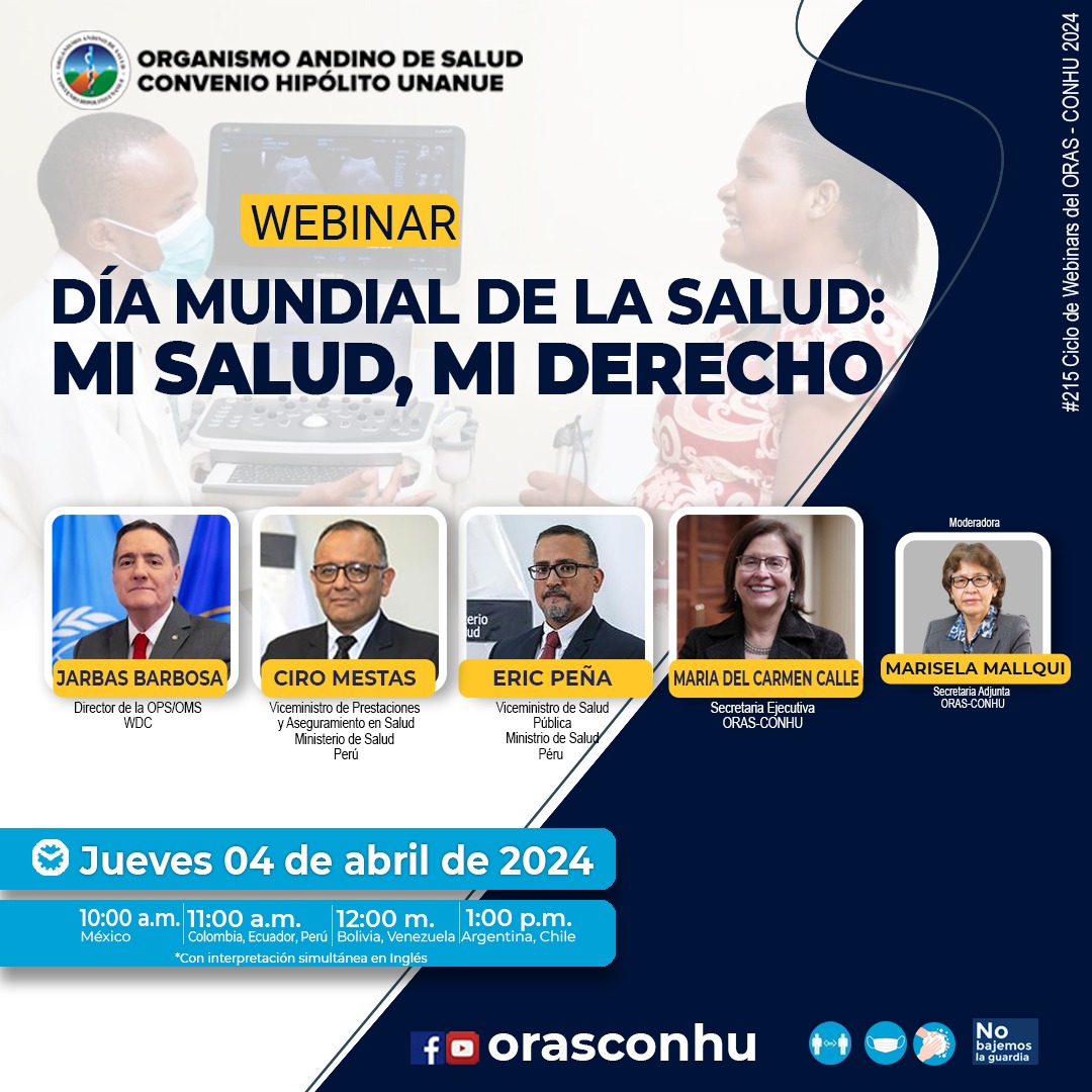 M, Mallqui., MC, Calle., J, Barbosa., C, Mestas., E, Peña. (2024, 4 abril). W0216 Día Mundial de la Salud: Mi salud, mi derecho [Webinar]. Organismo Andino de Salud - Convenio Hipólito Unanue