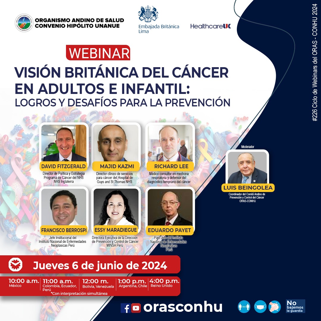 L, Beingolea., MC, Calle., D, Fitzgerald., M, Kazmi., R, Lee., F, Berrospi., E, Maradiegue., E, Payet. (2024, 6 junio). W0226 Visión británica del cáncer en adultos e infantil: logros y desafíos para la prevención [Webinar]. Organismo Andino de Salud - Convenio Hipólito Unanue