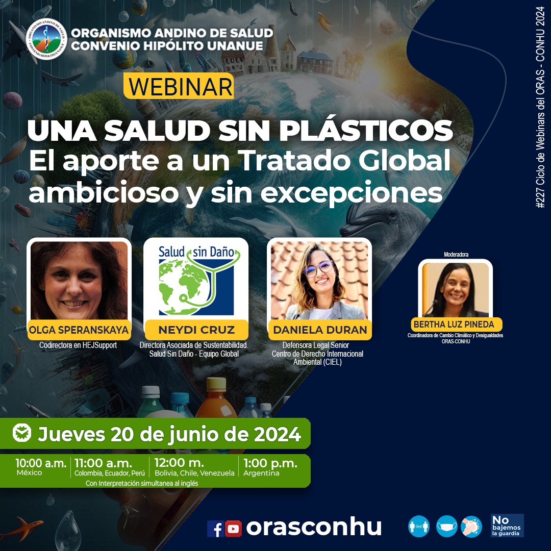 BL, Pineda., MC, Calle., O, Speranskaya., A, Prevodnik., N, Cruz., D, Durán. (2024, 20 junio). W0227 Una salud sin plásticos: el aporte de un Tratado Global ambicioso y sin excepciones [Webinar]. Organismo Andino de Salud - Convenio Hipólito Unanue