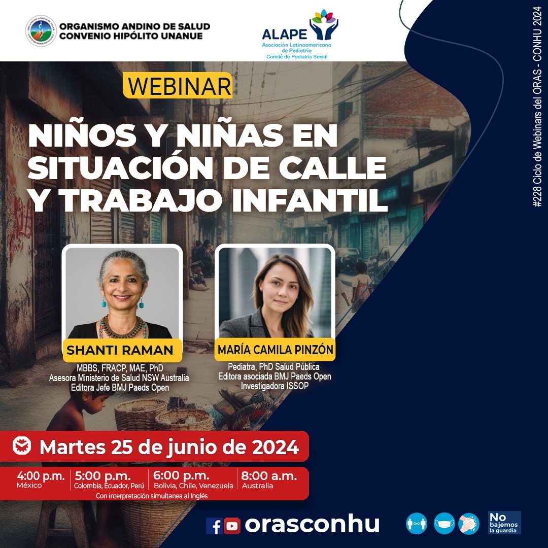 M, Mallqui., S, Raman., M, Pinzón. (2024, 25 junio). W0228 Niños y niñas en situación de calle y trabajo infantil [Webinar]. Organismo Andino de Salud - Convenio Hipólito Unanue
