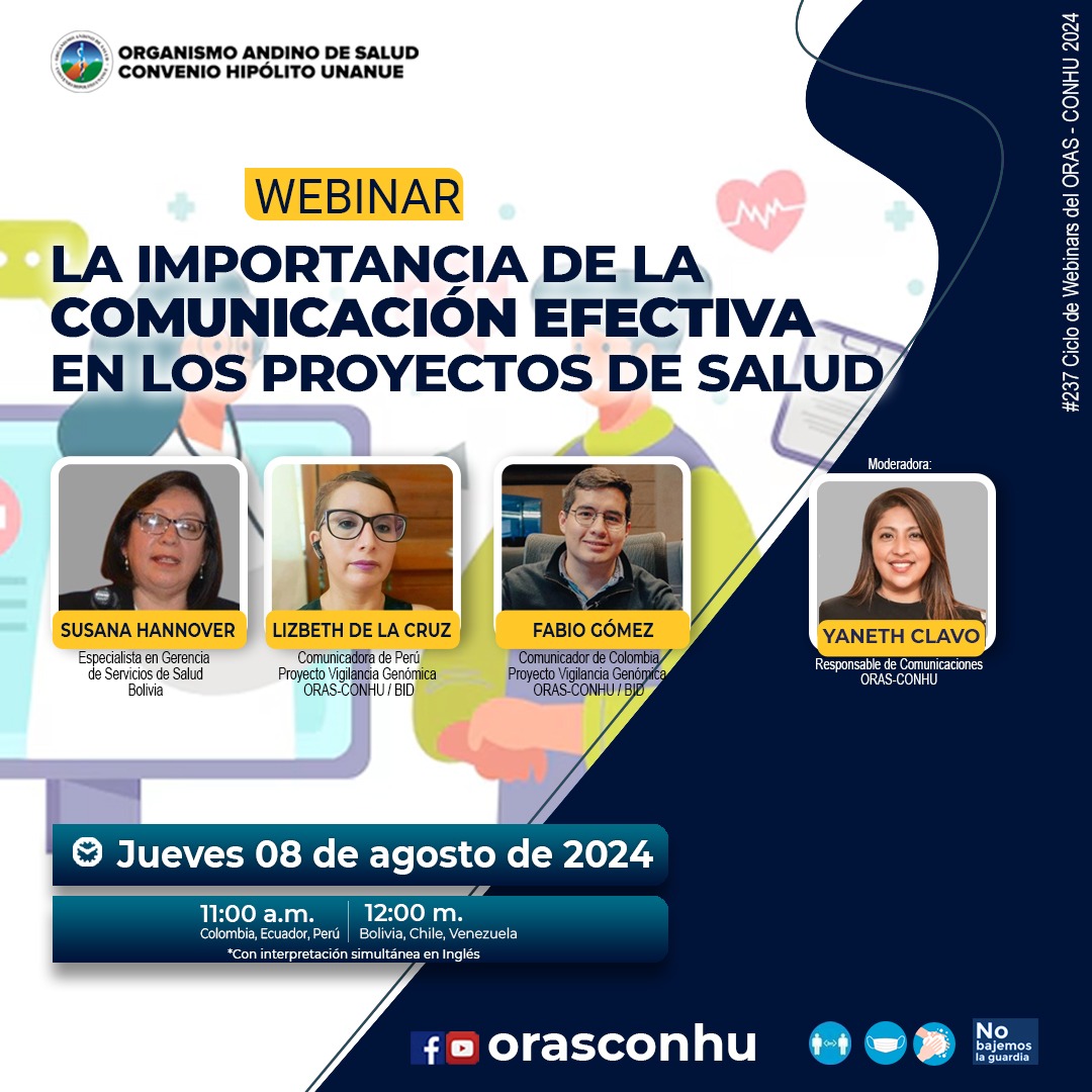 M, Hinojosa., Y, Clavo., S, Hannover., L, De La Cruz., F, Gómez. (2024, 8 agosto). W0237 La importancia de la comunicación efectiva en proyectos de salud [Webinar]. Organismo Andino de Salud - Convenio Hipólito Unanue