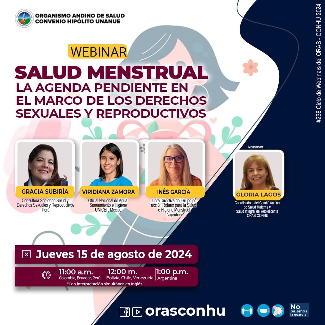 G, Lagos., G, Subiría., V, Zamora., I, García. (2024, 15 agosto). W0238 Salud Menstrual: la agenda pendiente en el marco de los derechos sexuales y reproductivos [Webinar]. Organismo Andino de Salud - Convenio Hipólito Unanue