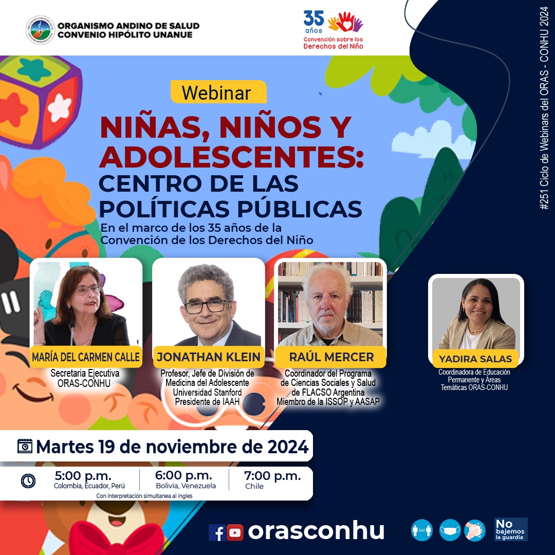 Y, Salas., MC, Calle., J, Kleyn., R, Mercer. (2024, 19 noviembre). W0251 Niñas, niños y adolescentes: centro de las políticas públicas [Webinar]. Organismo Andino de Salud - Convenio Hipólito Unanue