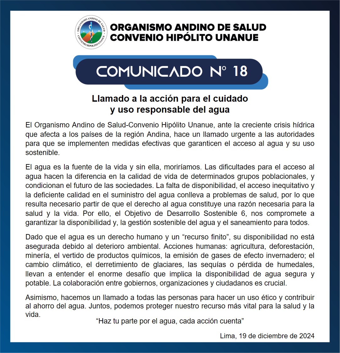 El Organismo Andino de Salud-Convenio Hipólito Unanue, ante la creciente crisis hídrica que afecta a los países de la región Andina, hace un llamado urgente a las autoridades para que se implementen medidas efectivas que garanticen el acceso al agua y su uso sostenible.