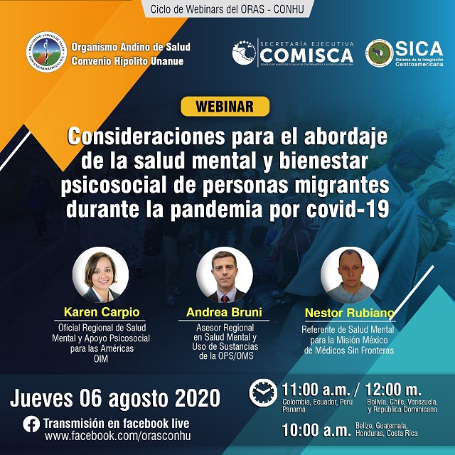 Descripción Karen Carpio, OIM. Andrea Bruni, Asesor en Salud Mental de la OPS/OMS Néstor Rubiano, Médicos Sin Fronteras. México. Moderador Gloria Lagos Enlace Video https://www.facebook.com/orasconhu/videos/609641966626253/?v=609641966626253