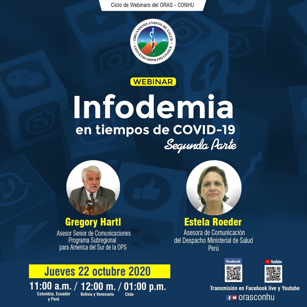 Descripción Sr. Gregory Hartl. Asesor Senior en Comunicaciones para el Programa Subregional para América del Sur de la OPS/OMS Sra. Estela Roeder. Asesora de Comunicación para el Despacho ministerial de Salud. Moderador Yaneth Clavo Enlace Video https://www.facebook.com/orasconhu/videos/377527616962076/