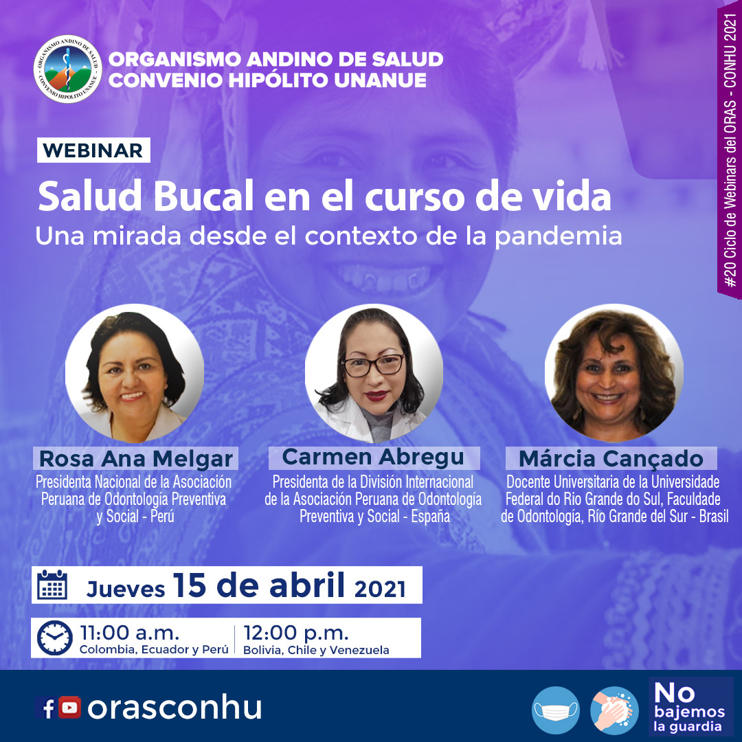 Salas, Y., Calle, María, Melgar, R., Abregu, C. & Cancado, M. (2021).Salud Bucal en el curso de vida. Una mirada desde el contexto de la pandemia [Webinar]. Organismo Andino de Salud Convenio Hipólito Unanue. https://www.youtube.com/watch?v=b80j2wIqALc