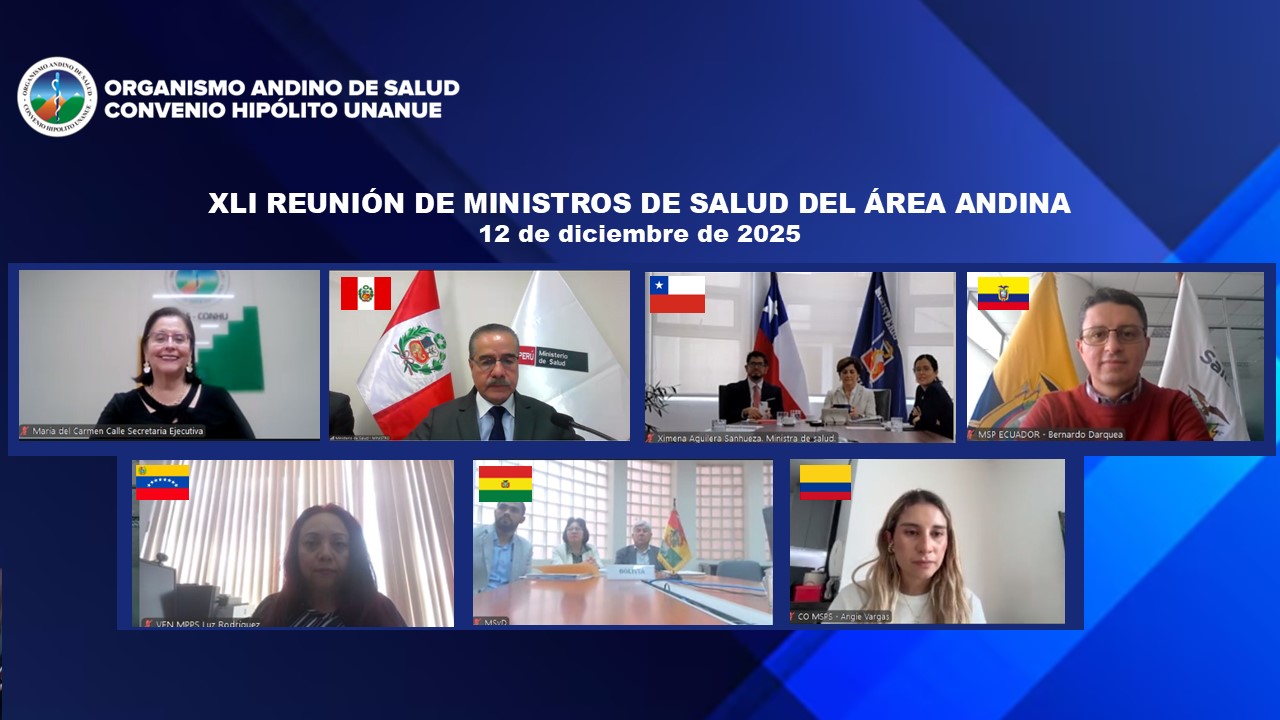 El Organismo Andino de Salud – Convenio Hipólito Unanue (ORAS-CONHU) realizó la XLI Reunión Ordinaria de Ministros de Salud del Área Andina (XLI REMSAA), celebrada de manera virtual bajo la Presidencia Pro Témpore del Dr. Luis Quiroz Avilés, Ministro de Salud de Perú, y de la Secretaria Ejecutiva del ORAS-CONHU, Dra. María del Carmen Calle Dávila. Participaron la Ministra de Salud de Chile, Dra. Ximena Aguilera; de Ecuador, el Viceministro de Gobernanza de la Salud, Dr. Bernardo José Darquea; de Venezuela, la Dra. Luz Rodríguez, Viceministra de Redes de Salud Colectiva; en representación de Bolivia, el asesor general de Despacho, Dr. Stanley Blanco; y de Colombia, la Lic. Angie Vargas, de Cooperación Internacional.