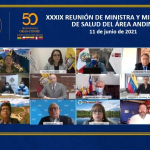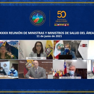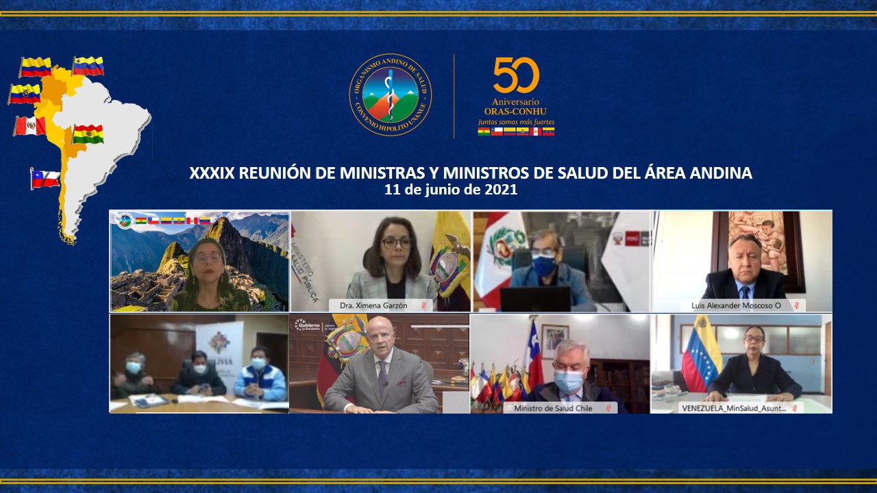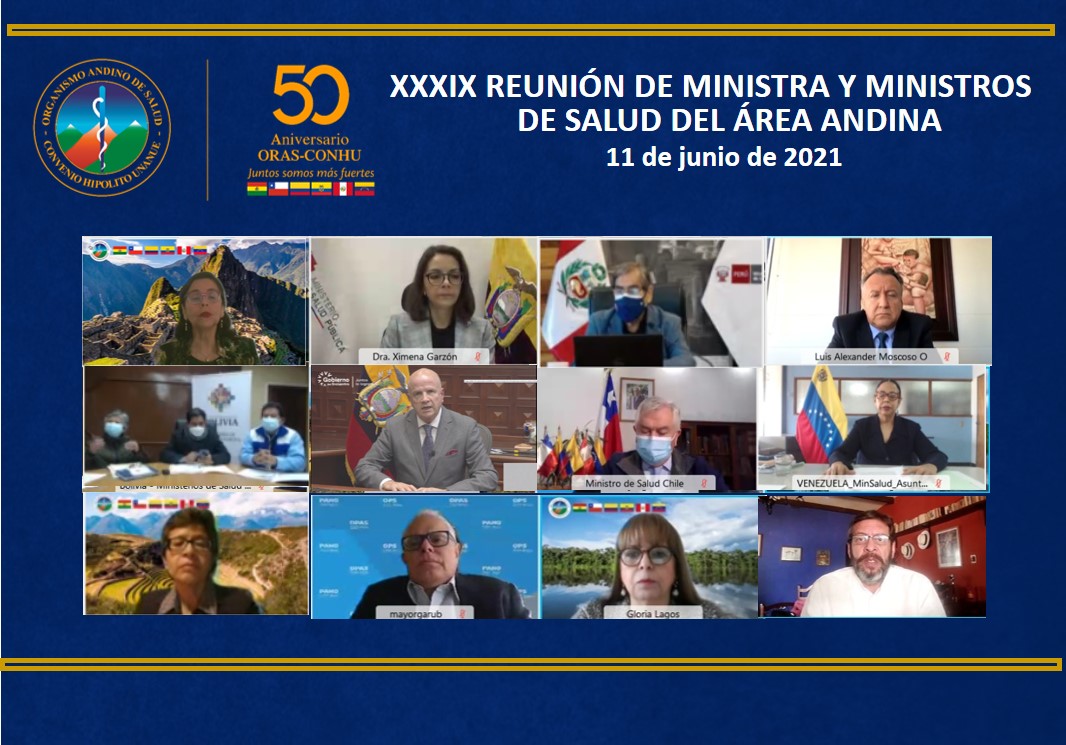 El 11 de junio del presente año se llevó a cabo la XXXIX Reunión de Ministros de Salud del Área Andina - REMSAA, con la participación del Ministro de Salud y Deportes de Bolivia, Dr. Jeyson Auza Pinto; el Ministro de Salud de Chile, Dr. Enrique Paris Mancilla, el Viceministro de Salud Pública de Colombia, Dr. Luis Alexander Moscoso; la Ministra de Salud Pública del Ecuador, Dra. Ximena Garzón-Villalba; el Ministro de Salud de Perú, Dr. Oscar Ugarte Ubilluz, la Viceministra de Redes de Salud Colectivas de la República Bolivariana de Venezuela, Dra. Marisela Bermúdez. Acompañaron la reunión el Presidente del Parlamento Andino, Dr. Adolfo Mendoza Leigue; y el Coordinador del Programa Subregional para América del Sur de la OPS/OMS Dr. Rubén Mayorga Sagastume; así como el equipo del ORAS CONHU.