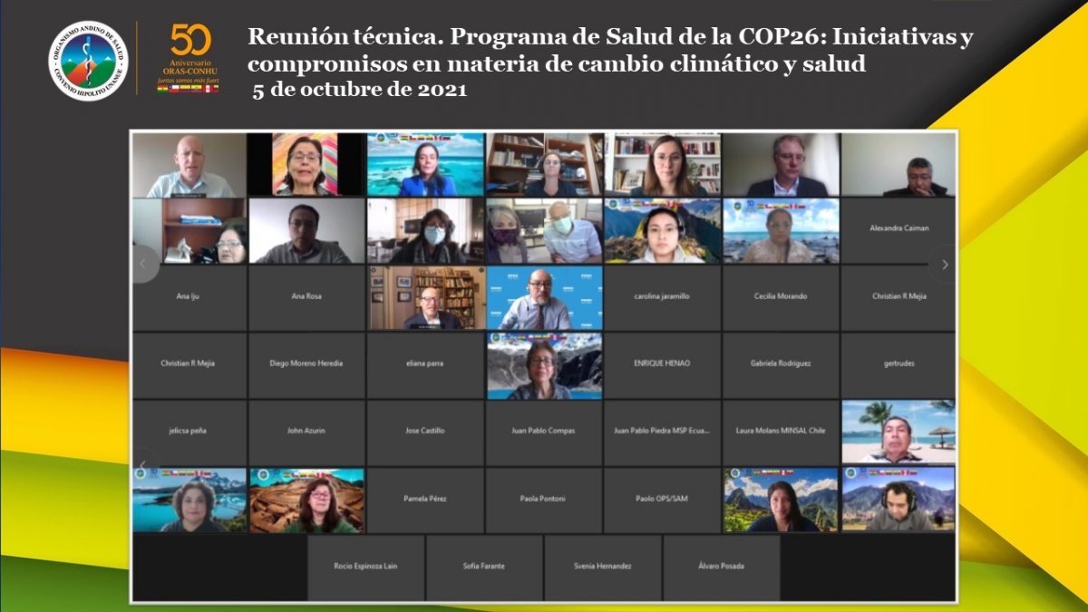 Se presentó el Programa de salud de la COP26: iniciativas y compromisos en materia de cambio climático y salud a los funcionarios del Comité Andino de Salud para la Gestión del Riesgo de Emergencias y Desastres, y Cambio Climático; con el objetivo de conocer el programa de salud de la COP26, así como las iniciativas y apoyo disponible para la construcción de sistemas de salud resilientes, sostenibles y bajos en carbono. Para estas presentaciones asistieron los Representantes de la Presidencia de la COP26; Representantes de la Unidad de Salud y Cambio Climático de la OMS, del Programa Subregional para América del Sur; y del área de Cambio Climático y Determinantes Ambientales de la Salud ambos de la OPS/OMS; Representantes de la ONG Salud sin Daño; y funcionarios del Organismo Andino de Salud - Convenio Hipólito Unanue.