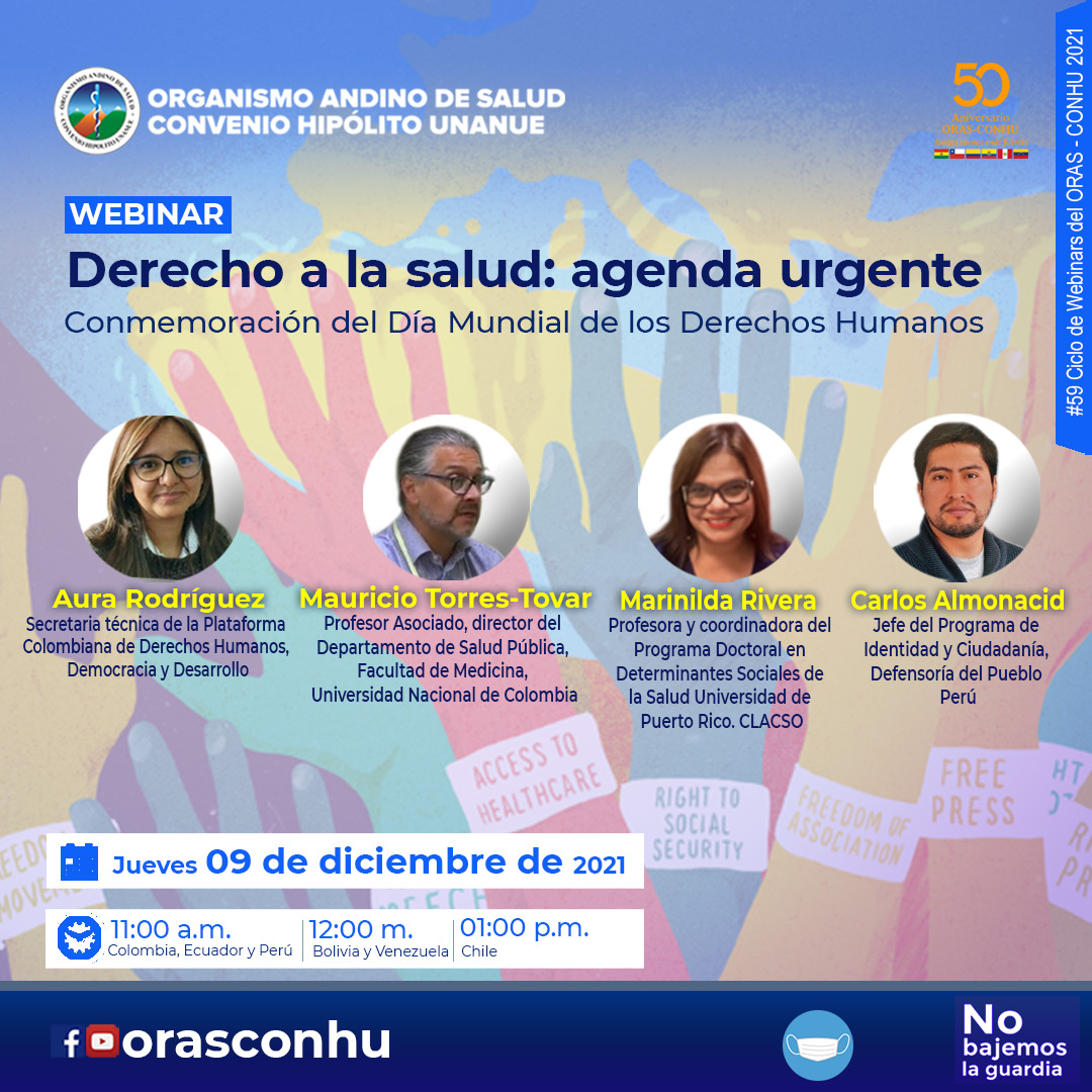 Pineda, Luz, Calle, María del Carmen, Rodríguez, Aura, Torres-Tovar, Mauricio, Rivera, Marinilda, Almonacid, Carlos (2021, 09 diciembre). Derecho a la salud: agenda urgente [Webinar]. Organismo Andino de Salud Convenio Hipólito Unanue. https://www.youtube.com/watch?v=Mxi5jSRZDN8