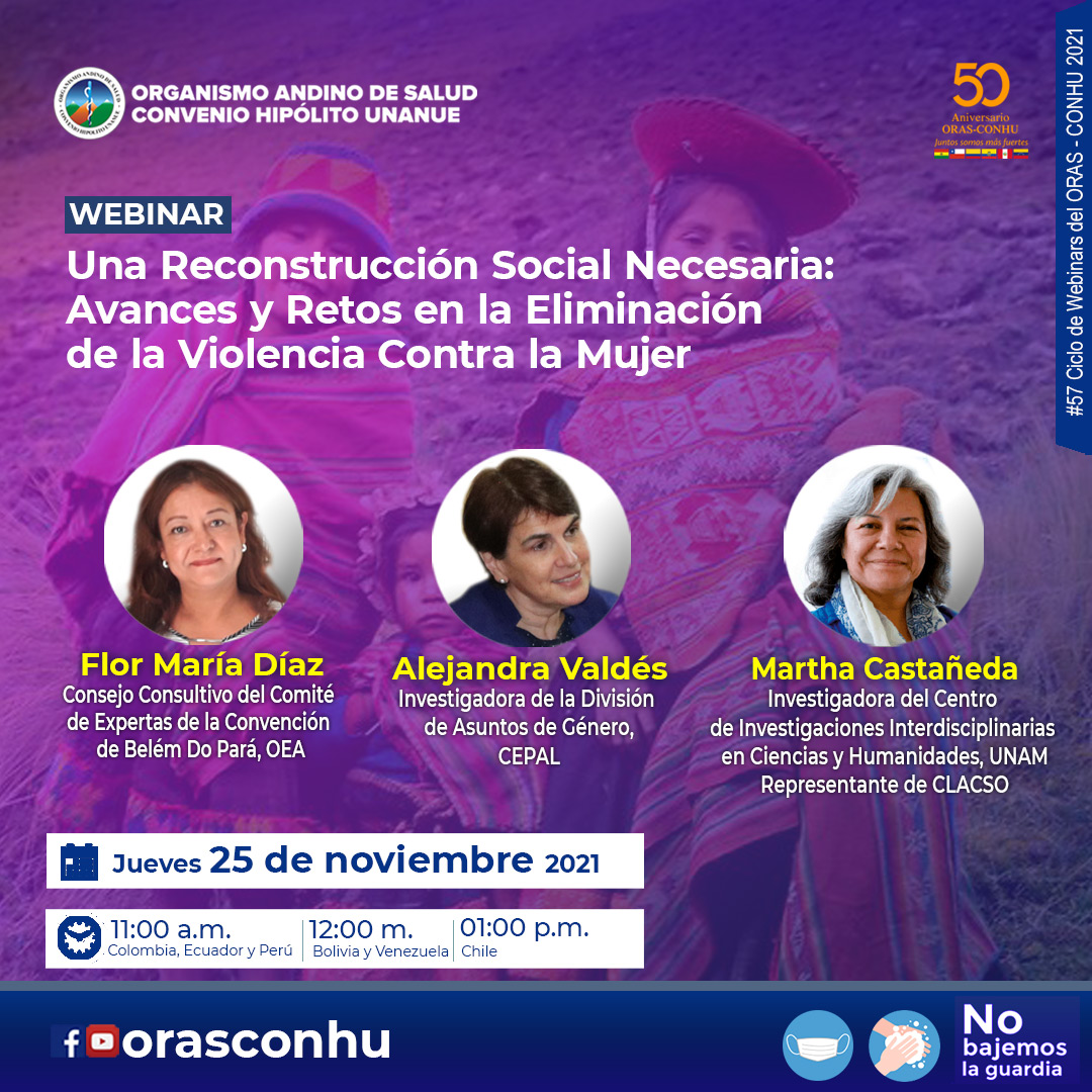 Díaz, Ruby, Calle, María, Díaz, Flor-María, Valdes, Alejandra y Castañeda, Martha (2021, 25 noviembre). Una Reconstrucción Social Necesaria: Avances y Retos en la Eliminación de la Violencia Contra la Mujer [Webinar]. Organismo Andino de Salud Convenio Hipólito Unanue. https://www.youtube.com/watch?v=bHhWSS0zuLE