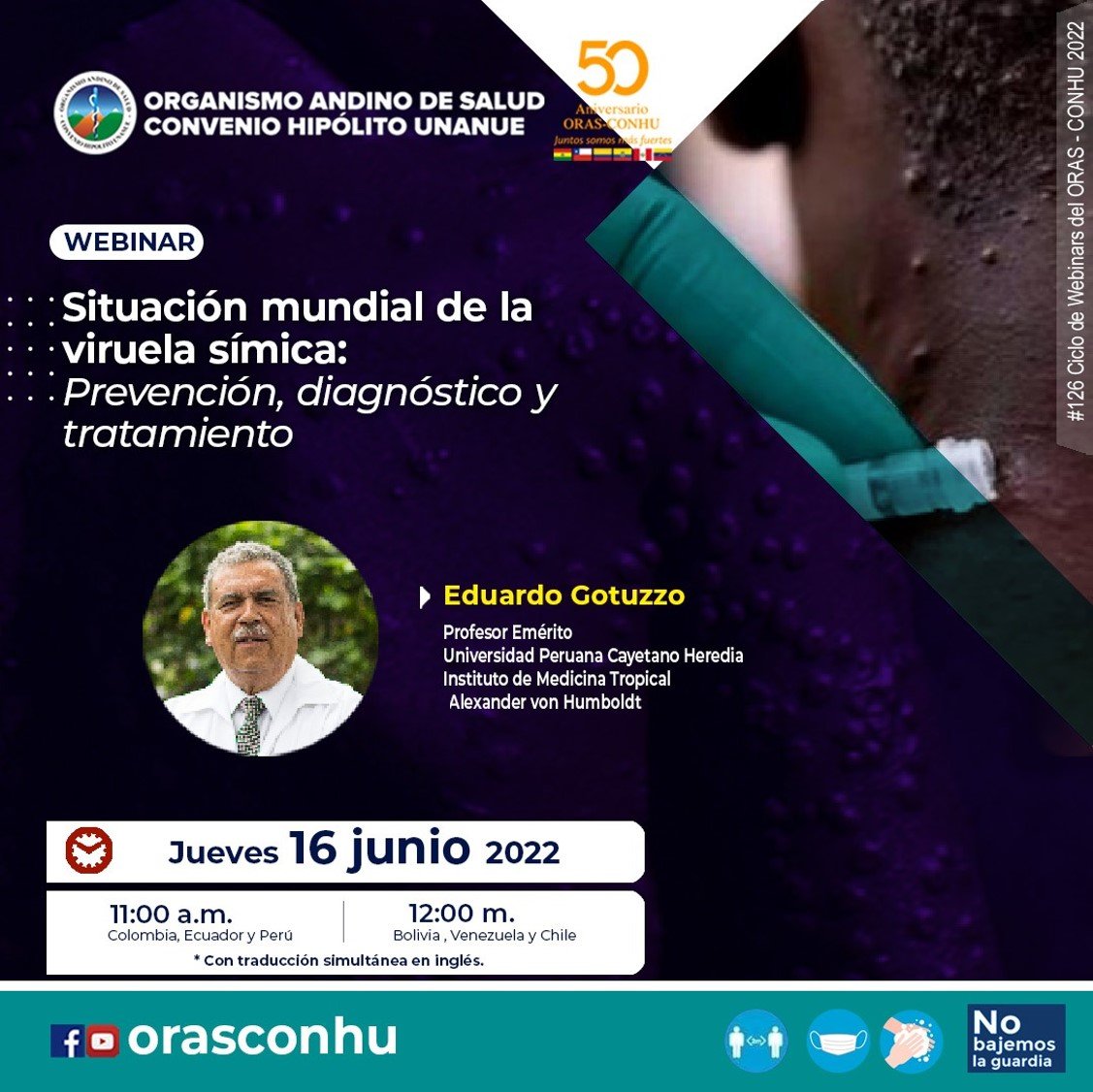 Beingolea, L., Calle, MC., Gotuzzo, E,. (2022, 16 junio). Situación mundial de la viruela símica: Prevención, diagnóstico y tratamiento [Webinar]. Organismo Andino de Salud - Convenio Hipólito Unanue.