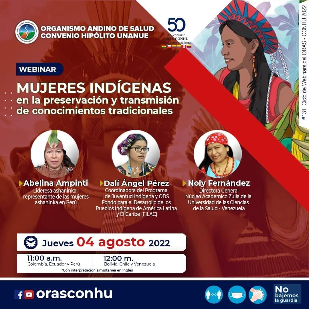 Lagos, G., Calle, MC., Ampinti, A., Pérez, Ángel,. Fernández, Noly. (2022, 4 agosto). Mujeres indígenas en la preservación y transmisión de conocimientos tradicionales [Webinar]. Organismo Andino de Salud - Convenio Hipólito Unanue.