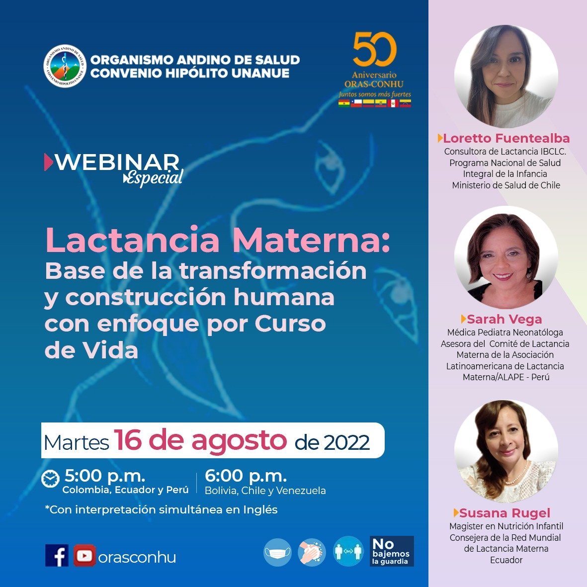 Hinojoza, M., Calle, MC., Fuentealba, L., Vega, S., Rugel, S (2022, 16 agosto). Lactancia Materna: Base de la transformación y construcción humana con enfoque por Curso de Vida [Webinar]. Organismo Andino de Salud - Convenio Hipólito Unanue.