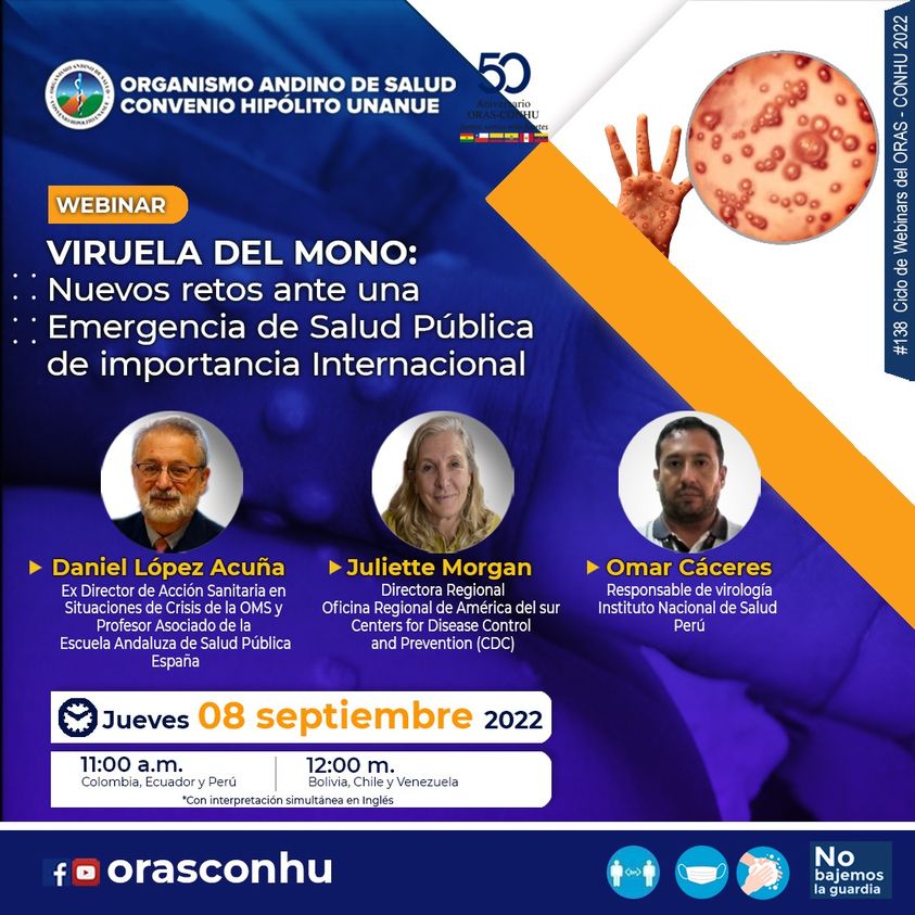 Beingolea, L., Calle, MC., López, D., Morgan, J., Cáceres, O. (2022, 8 setiembre). Viruela del mono: nuevos retos ante una emergencia de salud pública de importancia internacional [Webinar]. Organismo Andino de Salud - Convenio Hipólito Unanue.