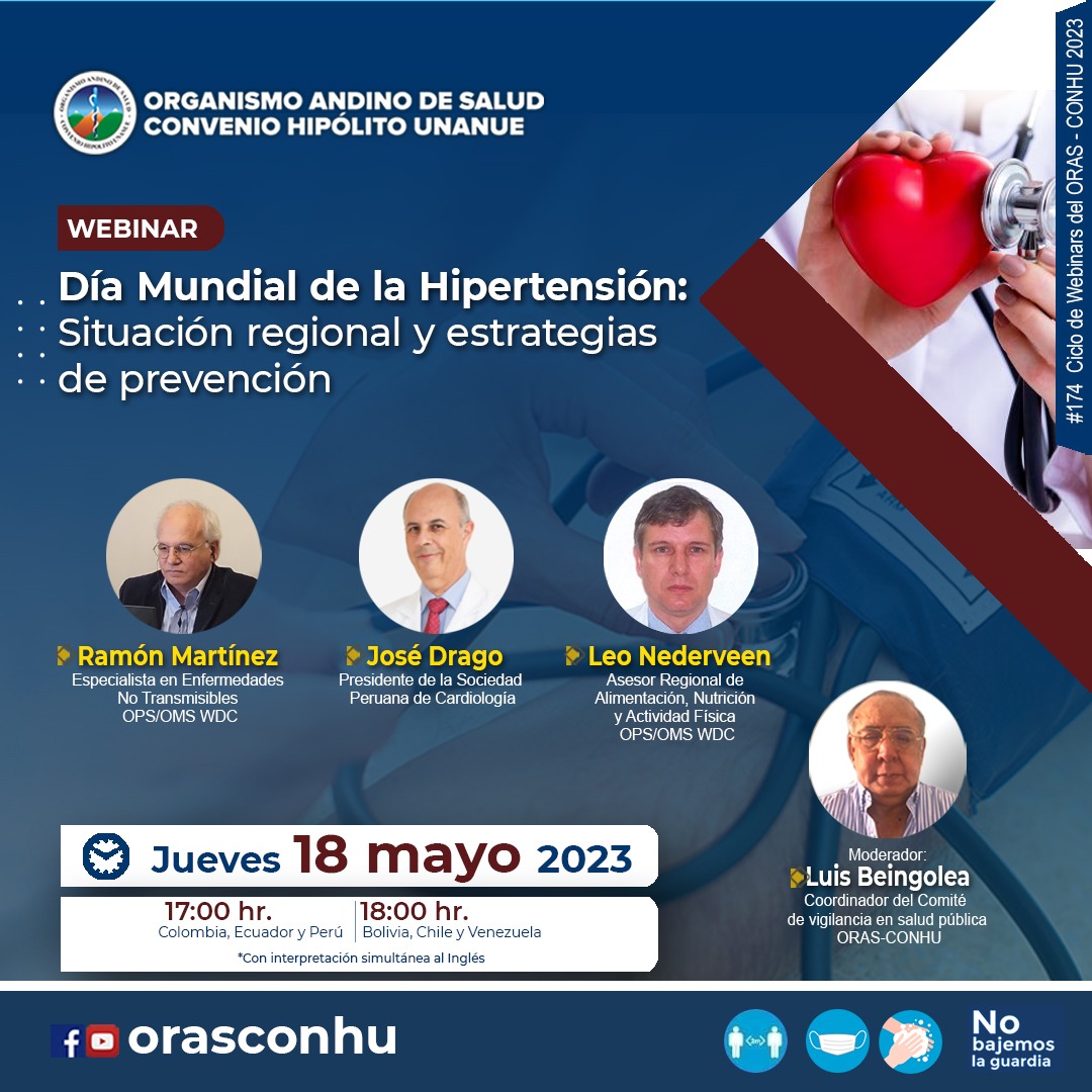 L, Beingolea., MC, Calle., R, Martínez., J, Drago., L, Nederveen. (2023, 18 mayo). W0174 Día Mundial de la Hipertensión: Situación regional y estrategias de prevención [Webinar]. Organismo Andino de Salud - Convenio Hipólito Unanue.