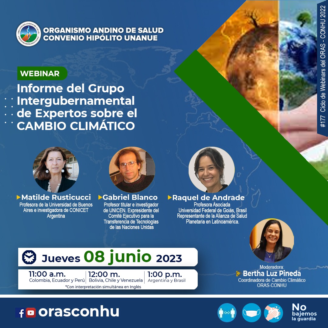 BL, Pineda., MC, Calle., M, Rusticucci., G, Blanco., R. de Andrade. (2023, 8 junio). W0177 Informe del Grupo Intergubernamental de Expertos sobre el Cambio Climático [Webinar]. Organismo Andino de Salud - Convenio Hipólito Unanue.