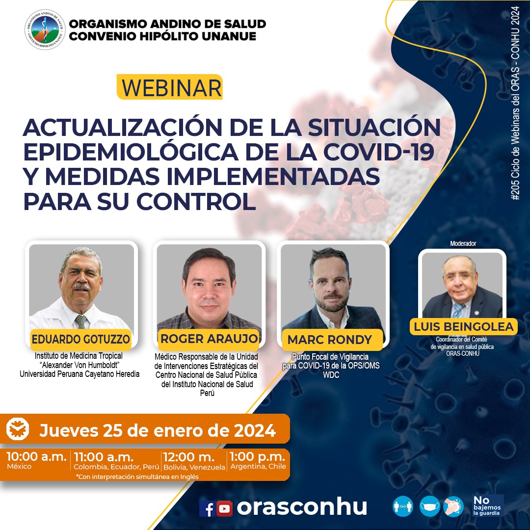L, Beingolea, MC, Calle., E, Gotuzzo., R, Araujo. M, Rondy (2024, 25 enero). W0205 "ECOSISTEMA DIGITAL del ORAS-CONHU: democratizando la información en salud [Webinar]. Organismo Andino de Salud - Convenio Hipólito Unanue