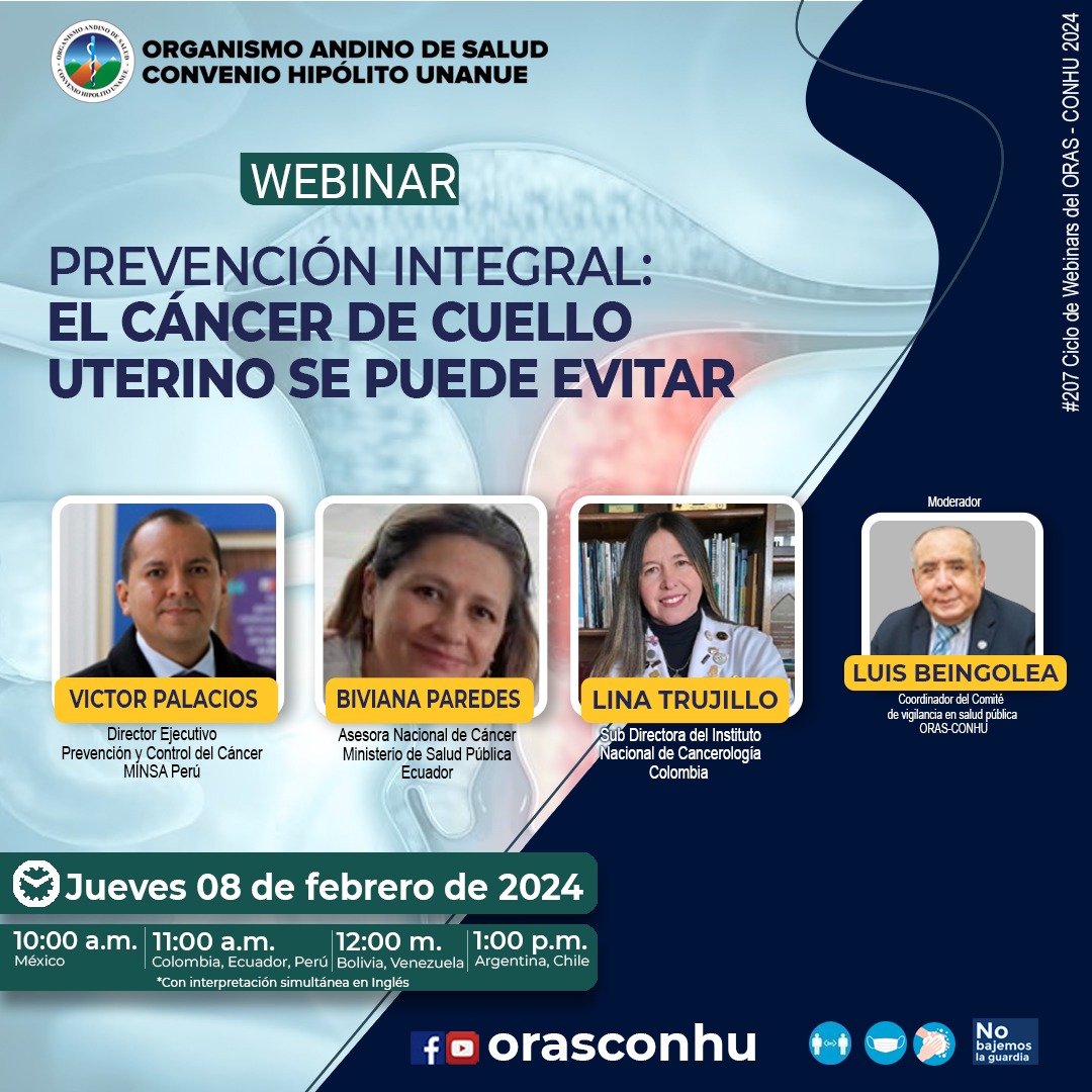 L, Beingolea., MC, Calle., V, Palacios., B, Paredes., L, Trujillo (2024, 08 febrero). W0207 PREVENCIÓN INTEGRAL: El cáncer de cuello uterino se puede evitar [Webinar]. Organismo Andino de Salud - Convenio Hipólito Unanue