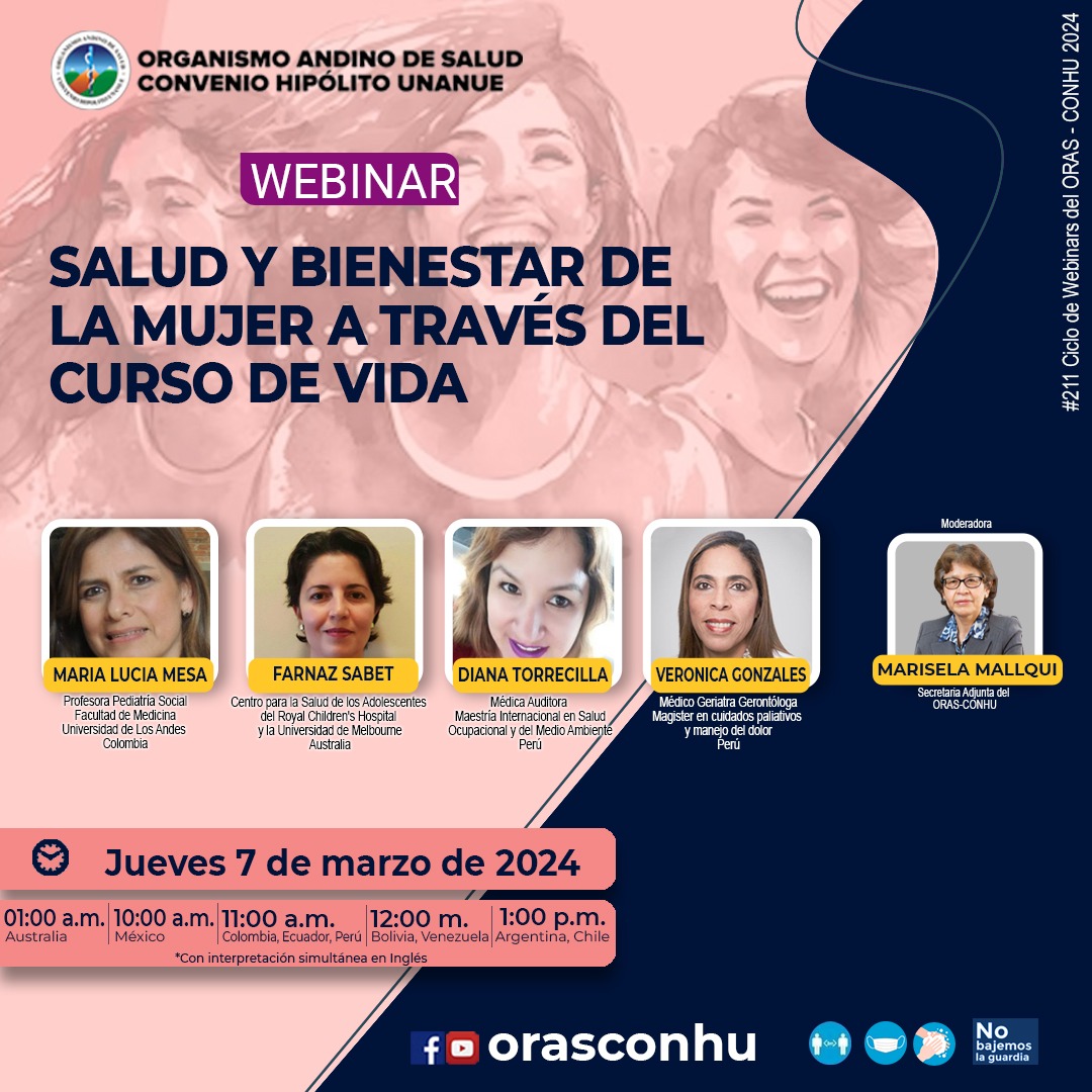 M, Mallqui., MC, Calle., M, Mesa., F, Sabet., D, Torrecilla. (2024, 7 marzo). W0211 Salud y bienestar de la mujer a través del curso de vida [Webinar]. Organismo Andino de Salud - Convenio Hipólito Unanue