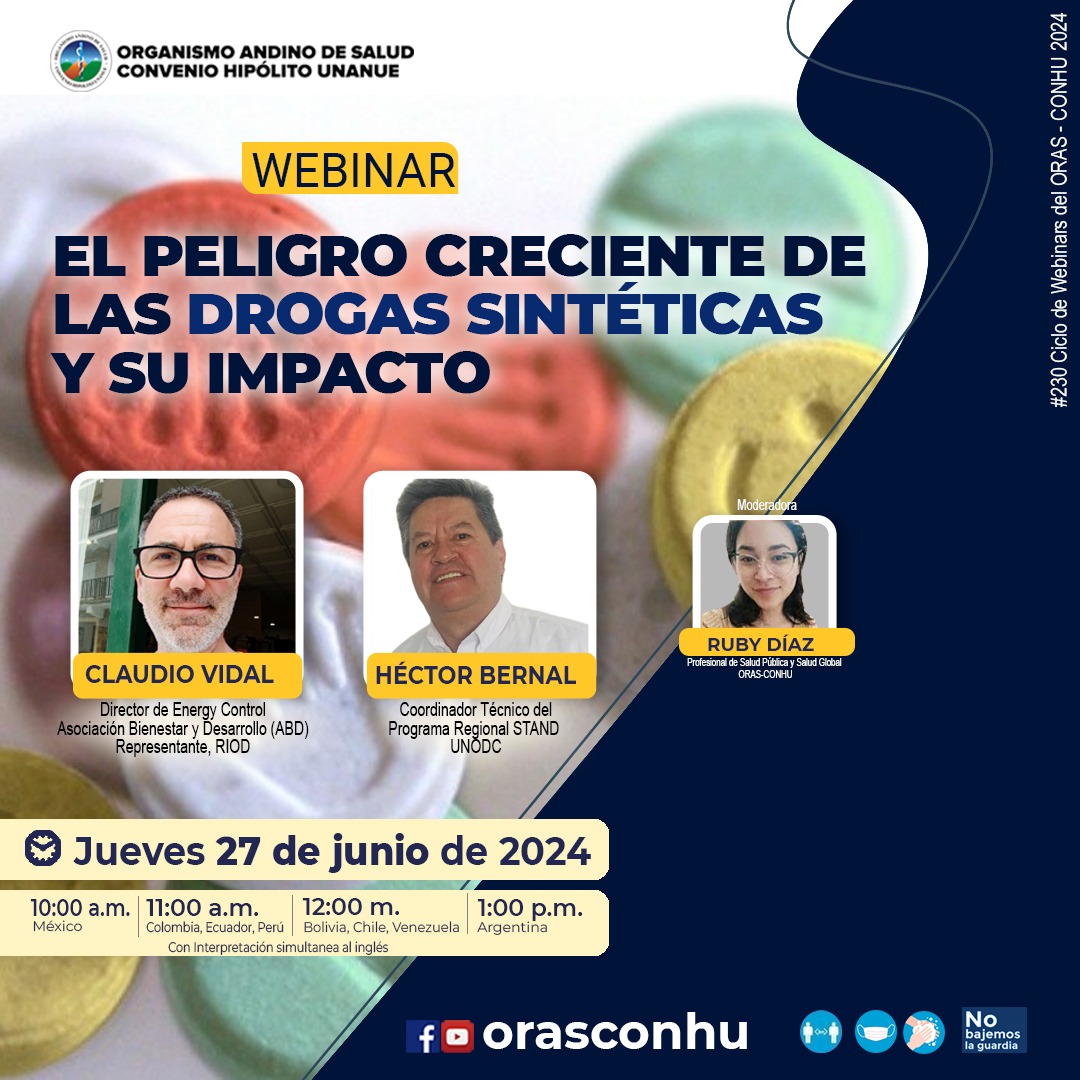 R. Diaz., MC, Calle., C, Vidal., H, Bernal. (2024, 27 junio). W0230 El peligro creciente de las drogas sintéticas y su impacto [Webinar]. Organismo Andino de Salud - Convenio Hipólito Unanue