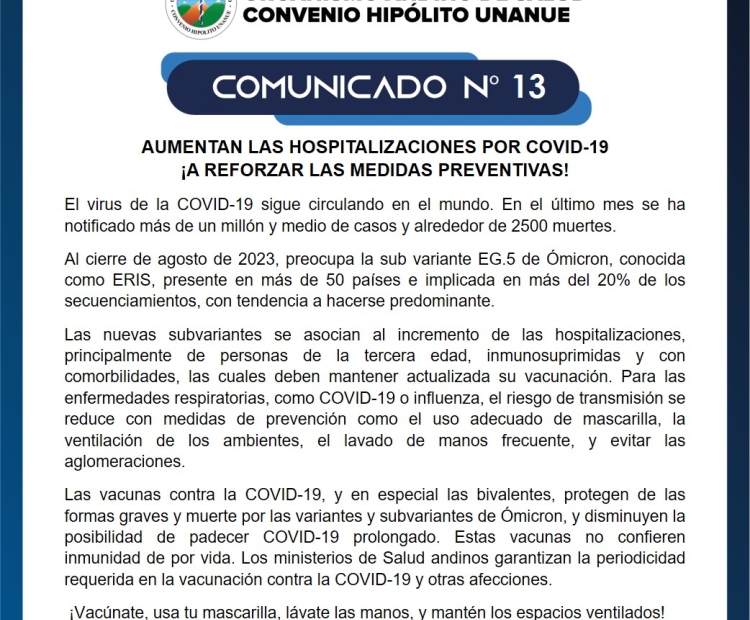 COMUNICADO N° 13 DEL ORAS-CONHU. Aumentan las hospitalizaciones por COVID-19 ¡A reforzar las medidas preventivas